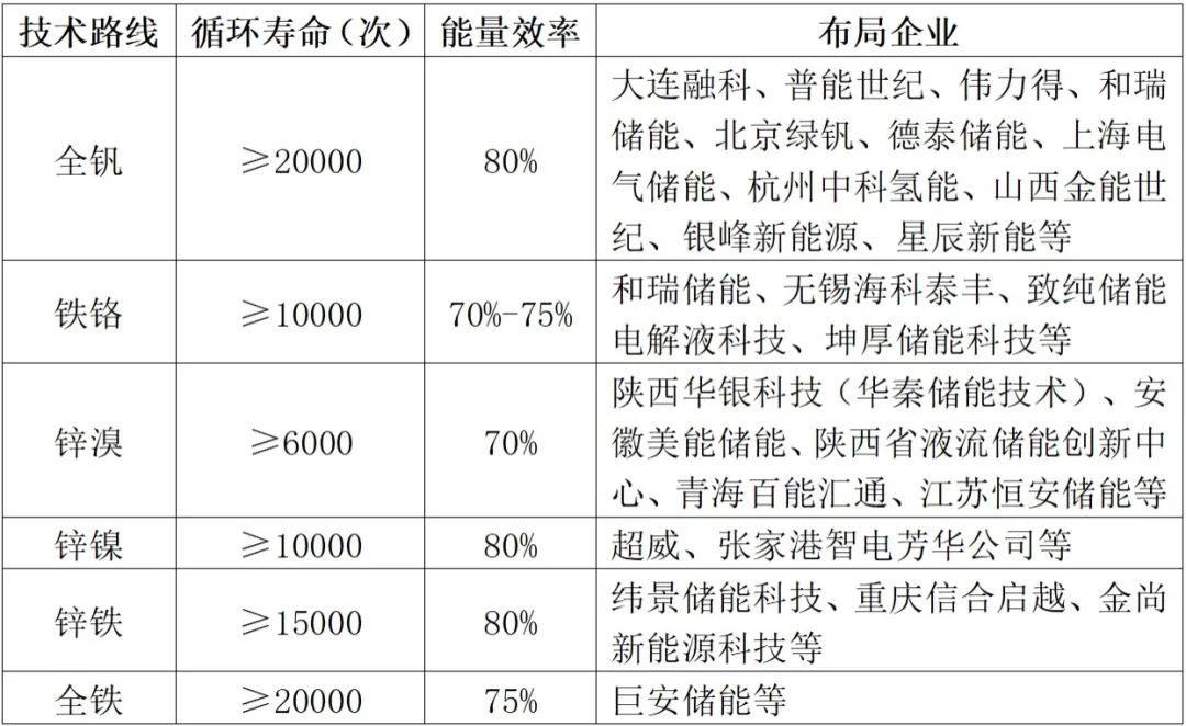 產業化進展整體仍處于初期階段。2022年以來,液流電池產業化進程不斷提速,僅2023年行業融資超過20億元,特別是隨著上海電氣儲能兆瓦級產品量產交付、緯景儲能全球首個吉瓦級液流電池工廠投產、大連融科百MW全釩液流電池儲能項目投運,產業發展進入快車道,目前各技術路線已經涌現了技術實力較強、產品系列較為齊全的規模企業(見表1)。