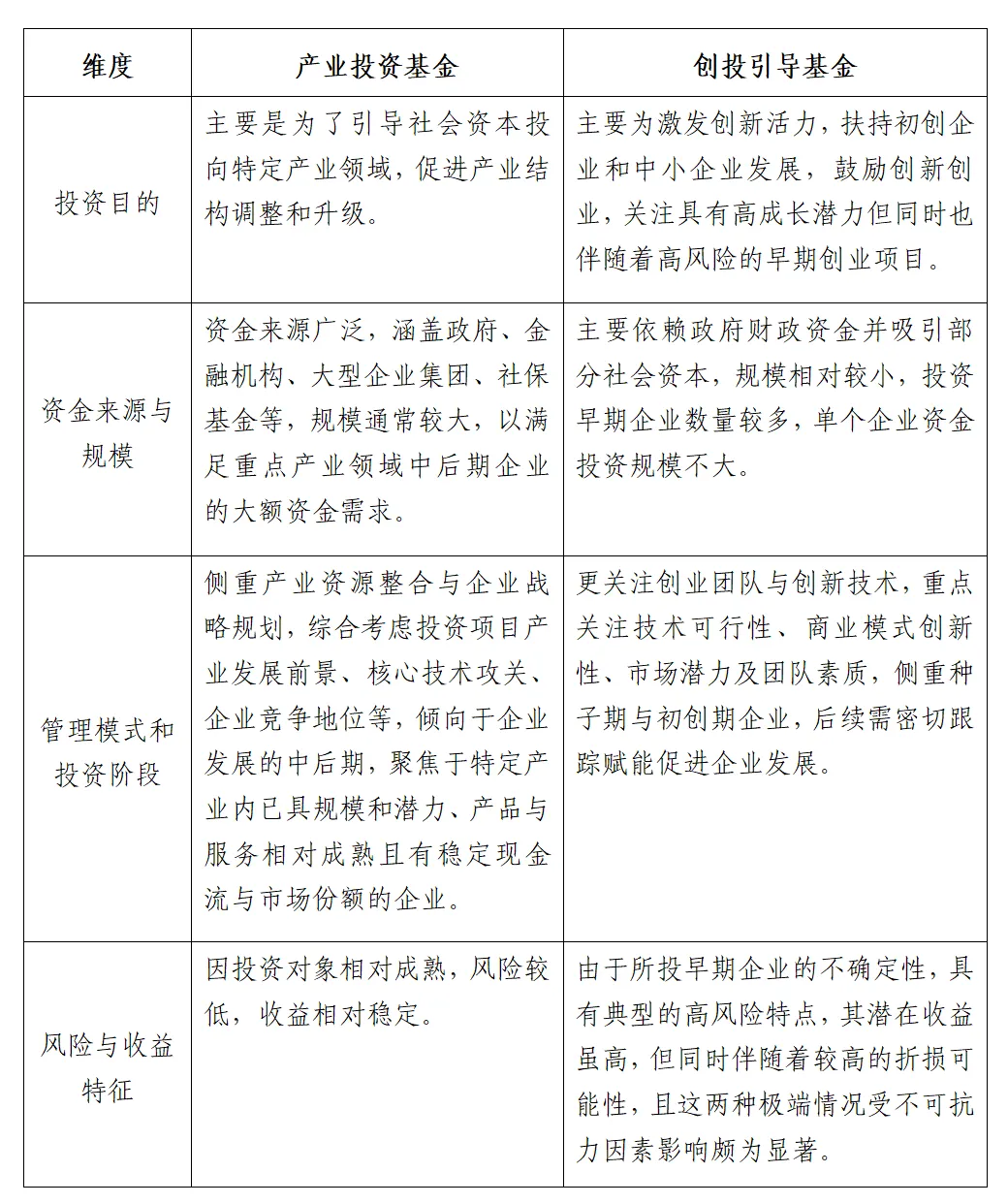 目前政府投資基金主要分為產(chǎn)業(yè)投資基金和創(chuàng)投引導(dǎo)基金,二者在多個(gè)維度上存在顯著差異。