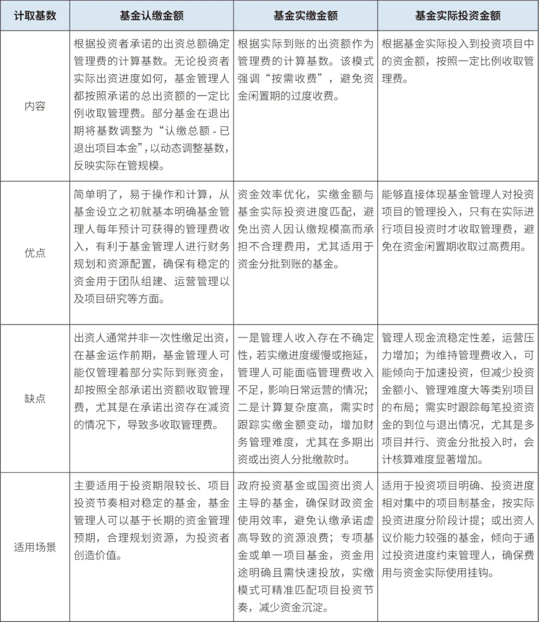 在私募股權投資基金的運作中,管理費收取基數的確定方式多種多樣,不同的收取基數對基金的運營和各方利益有著不同的影響。常見的管理費計提基數有:基金認繳金額、基金實繳金額、基金實際投資金額。