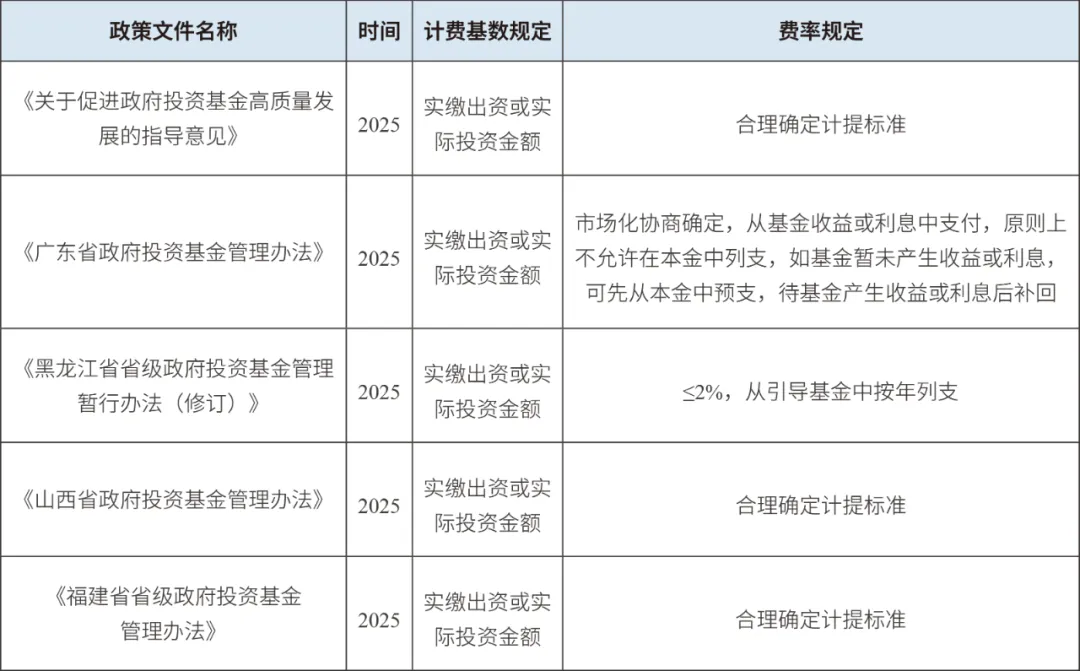 近年來,計費基數呈現從“認繳規模”向“實繳出資”或“實際投資金額”轉變的趨勢。2025年《國務院辦公廳關于促進政府投資基金高質量發展的指導意見》明確新設政府投資基金的管理費一般以此為計費基礎,隨后,廣東、黑龍江、山西、福建等省份新制定的管理辦法均同步響應。