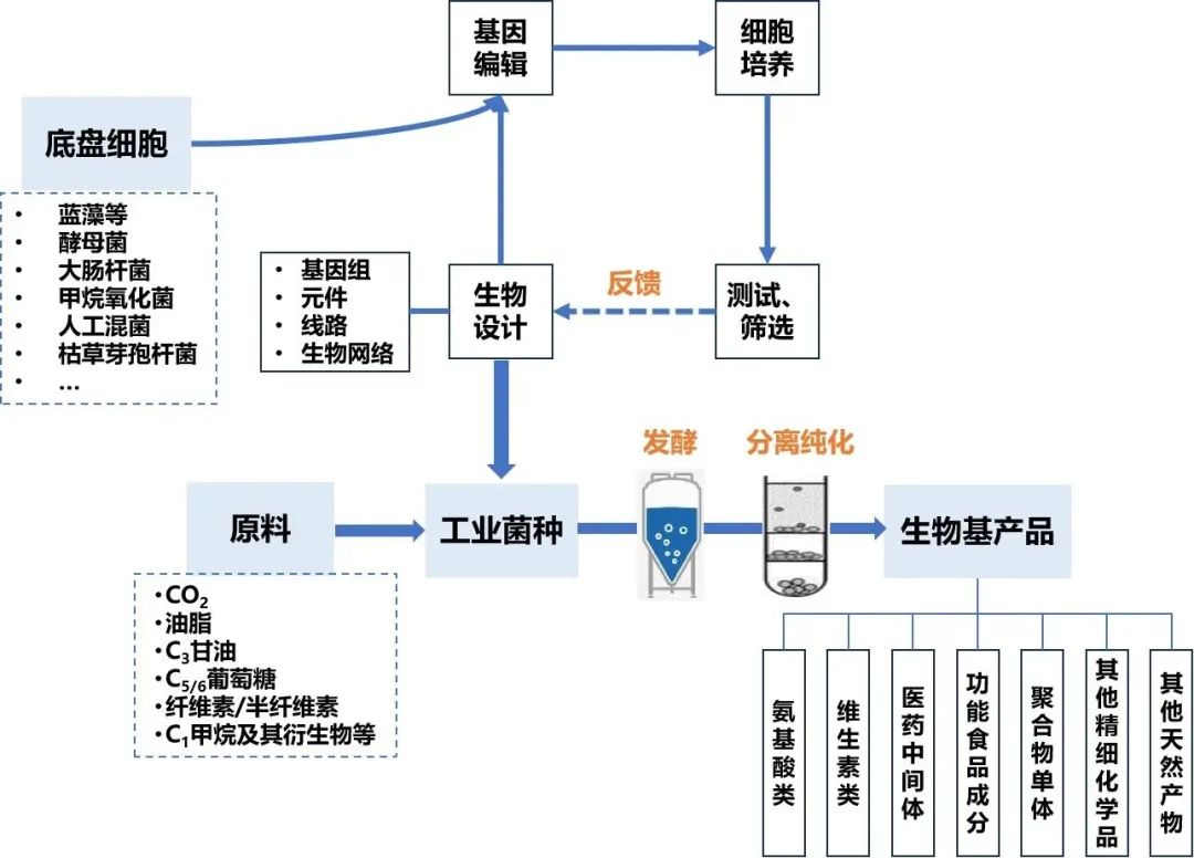 結(jié)合合成生物制造流程來(lái)看,其本質(zhì)就是“細(xì)胞工廠”,通過(guò)基因技術(shù)編輯底盤細(xì)胞,將生物碳基原料置于底盤細(xì)胞中進(jìn)行發(fā)酵,之后采用多種技術(shù)將發(fā)酵產(chǎn)品從發(fā)酵液或者細(xì)胞中分離、純化出來(lái),在達(dá)到特定標(biāo)準(zhǔn)后制成產(chǎn)品。更通俗地理解,底盤細(xì)胞相當(dāng)于奶牛,各種原料相當(dāng)于低價(jià)值的草料,通過(guò)改造優(yōu)化過(guò)的底盤細(xì)胞,添加低廉原料后經(jīng)過(guò)發(fā)酵等一系列工藝產(chǎn)生的高價(jià)值的化學(xué)或生物產(chǎn)品。