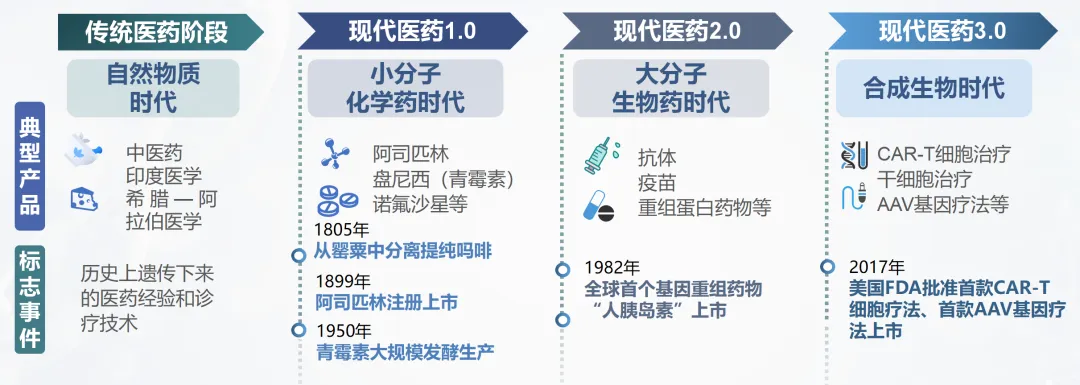 在生命科學(xué)技術(shù)加速演進(jìn)的驅(qū)動(dòng)下,醫(yī)療健康產(chǎn)業(yè)經(jīng)歷了從傳統(tǒng)到現(xiàn)代、從經(jīng)驗(yàn)到科學(xué)的四個(gè)階段的演變過程,當(dāng)前已經(jīng)進(jìn)入現(xiàn)代醫(yī)藥3.0時(shí)代。隨著高通量基因測(cè)序、CRISPR-Cas基因編輯等技術(shù)的快速更新迭代,合成生物這把探索生命奧秘的新鑰匙,與醫(yī)療健康的融合更加緊密,實(shí)現(xiàn)了從“造物致知”到“造物致用”的進(jìn)階式發(fā)展。