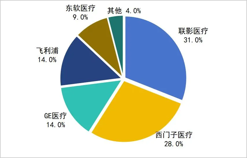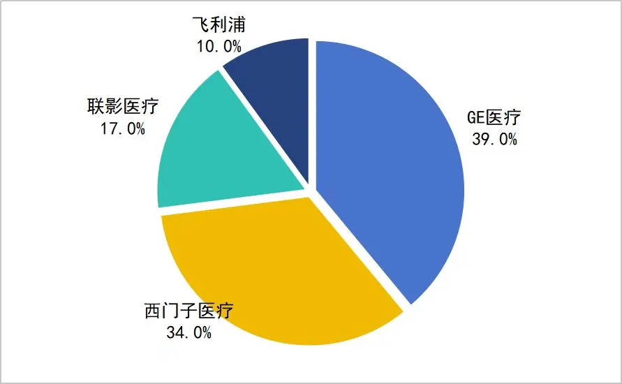 MR主要包括MR(1.5T)和MR(3.0T)兩種。其中,MR(3.0T)以其更高的信噪比、空間分辨率和掃描速度,極大提升了診斷精度,臨床應用日益廣泛,占據(jù)MR總體市場超52%的市場份額,且市場份額高度集中,GE醫(yī)療(39%)、西門子醫(yī)療(34%)、聯(lián)影醫(yī)療(17%)三家企業(yè)合計市占率近90%。聯(lián)影醫(yī)療、東軟醫(yī)療加速入局本次醫(yī)療設(shè)備更新,提升MR國產(chǎn)化率,其中東軟醫(yī)療以1.5T產(chǎn)品為主,聯(lián)影醫(yī)療在主導1.5T市場份額的基礎(chǔ)上強勢進軍3.0T市場。
