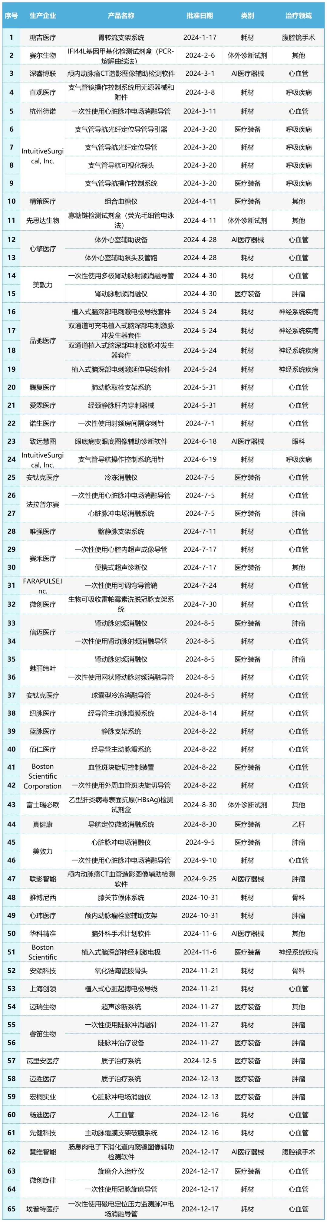 2024年,我國共有65款創(chuàng)新醫(yī)療器械獲得國家藥品監(jiān)督管理局(NMPA)批準上市,獲批數(shù)量創(chuàng)歷史新高,總體來看國際化發(fā)展態(tài)勢不斷增強,區(qū)域集聚效能愈發(fā)顯著,多款運用國際首創(chuàng)技術(shù)的國內(nèi)首款產(chǎn)品接續(xù)發(fā)布,展現(xiàn)出強大的創(chuàng)新能力和高質(zhì)量發(fā)展趨勢。獲批產(chǎn)品具體特點如下: